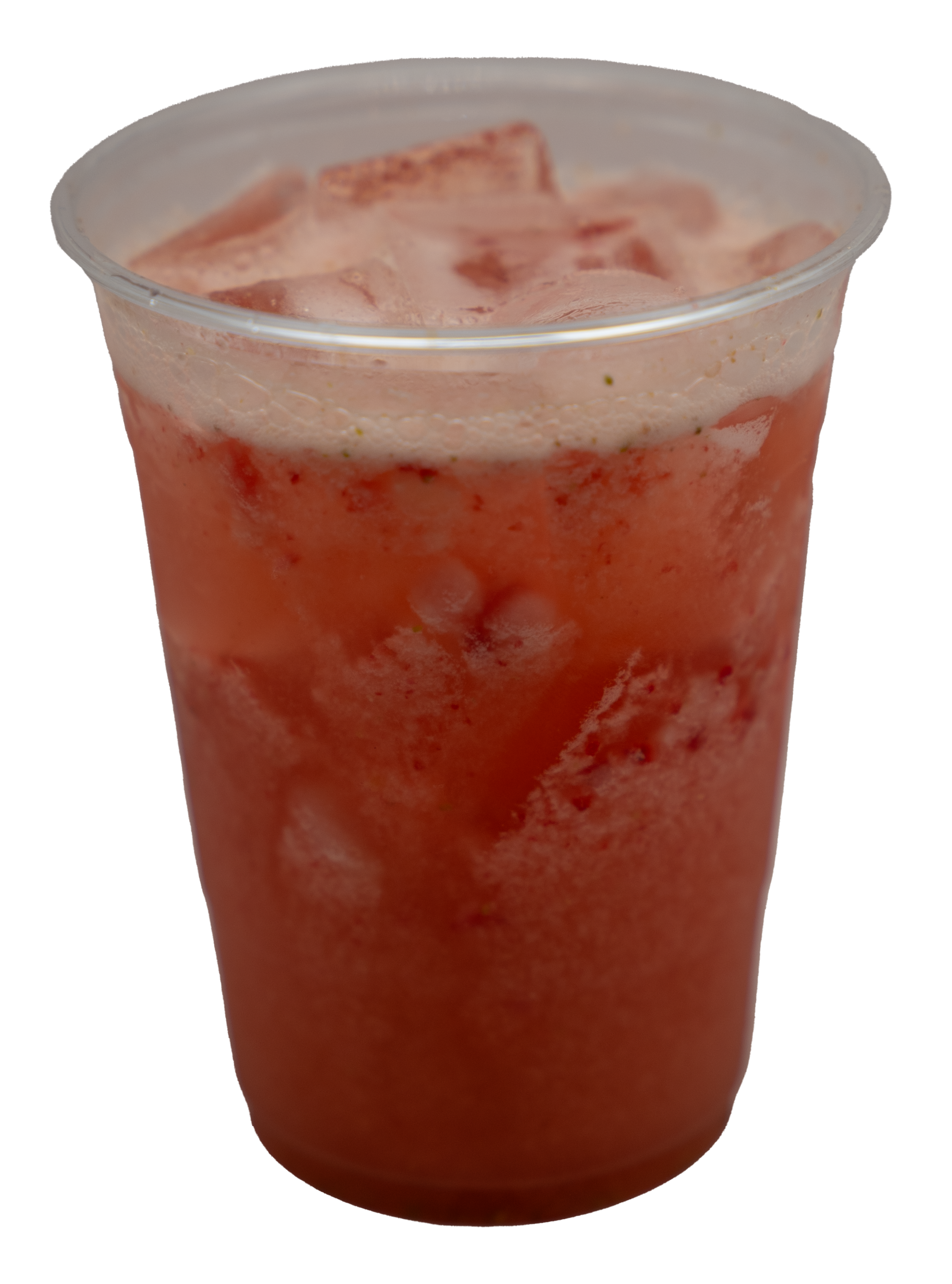 Blended strawberries, sugar, and lime, topped with ginger ale